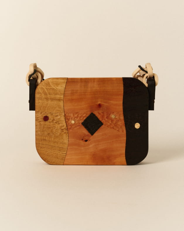 Die Divine neu zu interpretieren war ein sehr interessantes Projekt. Für mich ist diese Handtasche feminin, elegant, modern und hat mit ihren verschiedenen Einsätzen, Details und Texturen etwas Verspieltes. Ich wollte, dass sich diese vielfältige und leicht „poppige“ Ausprägung in meinem Objekt aus Holz wiederfindet und gleichzeitig meinem Ansatz treu bleiben, verschiedene Holzarten miteinander zu kombinieren. So habe ich eine „Patchwork“-Tasche entworfen, in der Wenge, Eiche und Birnbaum ein Wechselspiel eingehen. Kleine runde Intarsien aus Padouk, Bergahorn und Messing sorgen für den gewissen „Schick“.