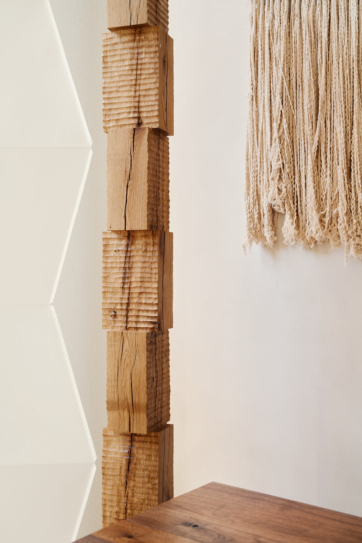 Ein einzigartiger Raum, in dem ein von Sessùn entworfener gewebter Wandbehang die Expertise von Laura Greindl, Gründerin von Atelier 365, die wir mit der Inneneinrichtung der Boutique betraut haben, ergänzt.