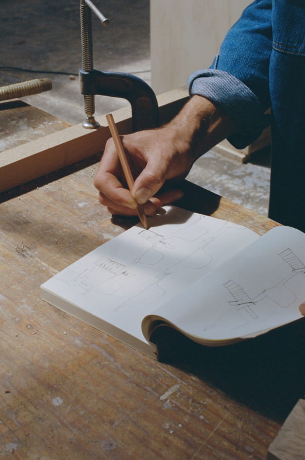 Ich habe festgestellt, dass ich bei der Gestaltung neuer Objekte schrittweise vorgehe. Zu Beginn versuche ich mir Formen, Texturen und Volumen vorzustellen, die das wiedergeben könnten, was mich interessiert. Dann versuche ich diese Formen durch Handzeichnungen zu visualisieren. Meist merke ich in dieser Phase, ob eine Idee umsetzbar ist oder nicht. Anschließend erstelle ich ein exaktes 3D-Modell des Objekts, um ihm die echten Proportionen zu verleihen und zu überlegen, wie es gebaut werden kann. Die Werkzeuge kommen erst ganz zum Schluss zum Einsatz, nämlich dann, wenn ich mit ausreichender Sicherheit sagen kann, dass es mir gelingen wird, etwas Funktionelles aus meiner Idee zu machen. Ich habe große Angst davor, Material zu verschwenden. Die erfüllendste Phase ist für mich, sobald ich mit Holz in Berührung komme, wenn ich anfange, mit den Astknoten, der Faser und der Maserung der Holzarten zu spielen... Ich würde sagen, dass dem eigentlichen Experimentieren viel Forschungsarbeit vorausgeht!
