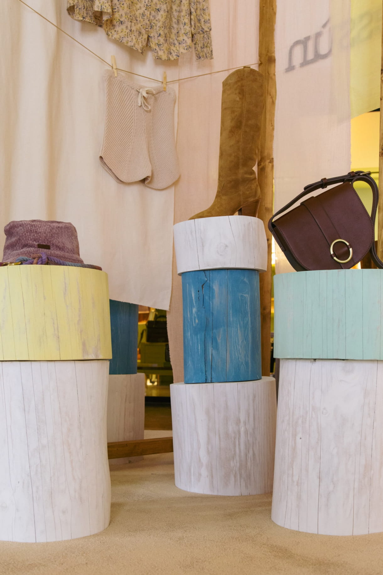 Mit dem einer Rauminstallation gleichenden Pop-up-Store, in dem die Kreationen der Marke mit Hängevorrichtungen aus gefärbten Stoffen zueinander in Beziehung gesetzt werden, gewährt Sessùn Einblick in ihr poetisches und sensibles Universum, das tief mit Farben und handwerklichen Techniken des Stofffärbens verbunden ist.